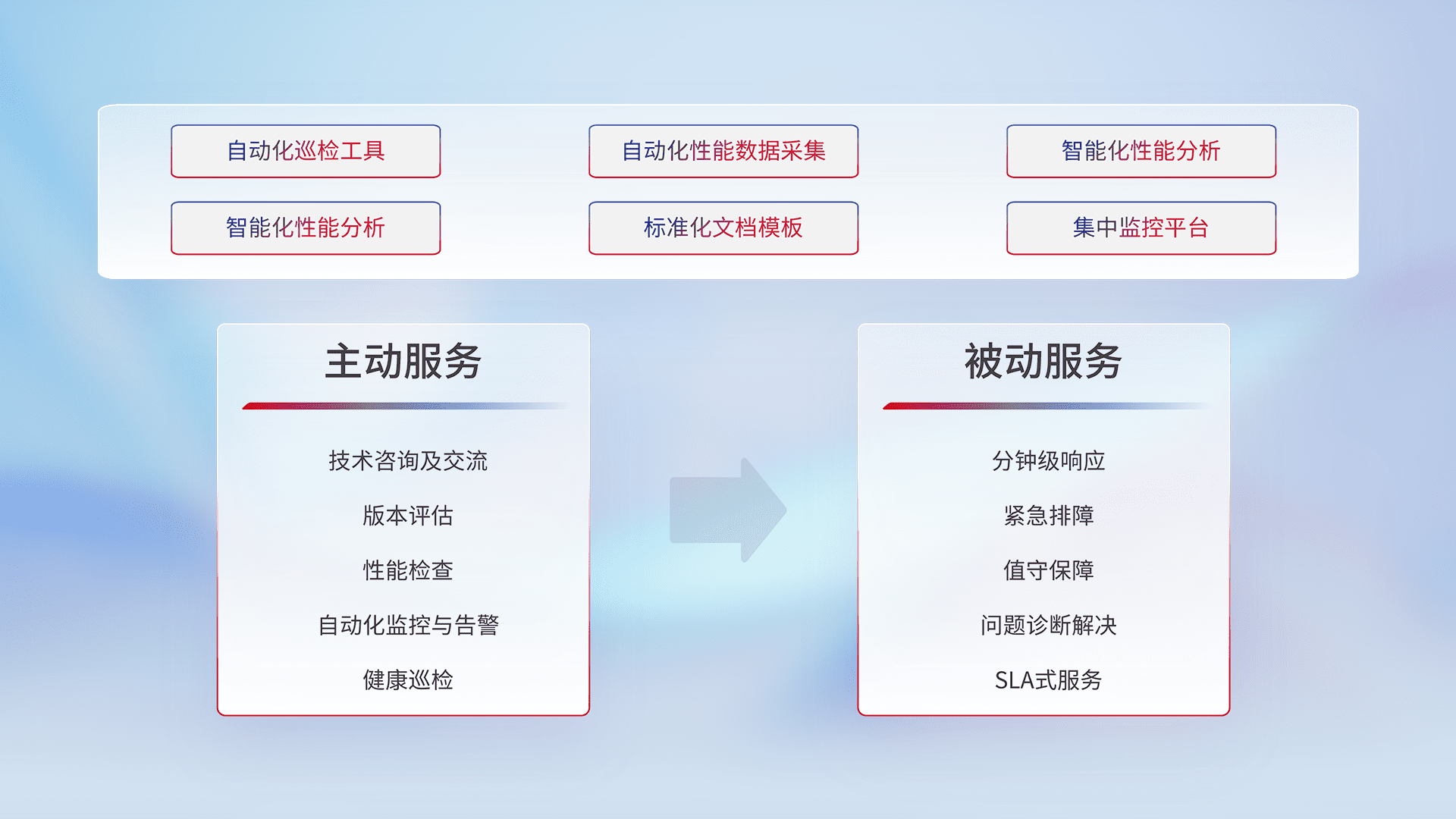 智能化工具和标准化文档,,保障服务质量,,提供主动服务(包含技术咨询、、版本评估、、性能检查、、自动化监控与告警、、、、健康巡检)和被动服务包含(分钟级响应、、、、紧急排障、、值守保障、、、问题诊断解决、、SLA服务)。。。。